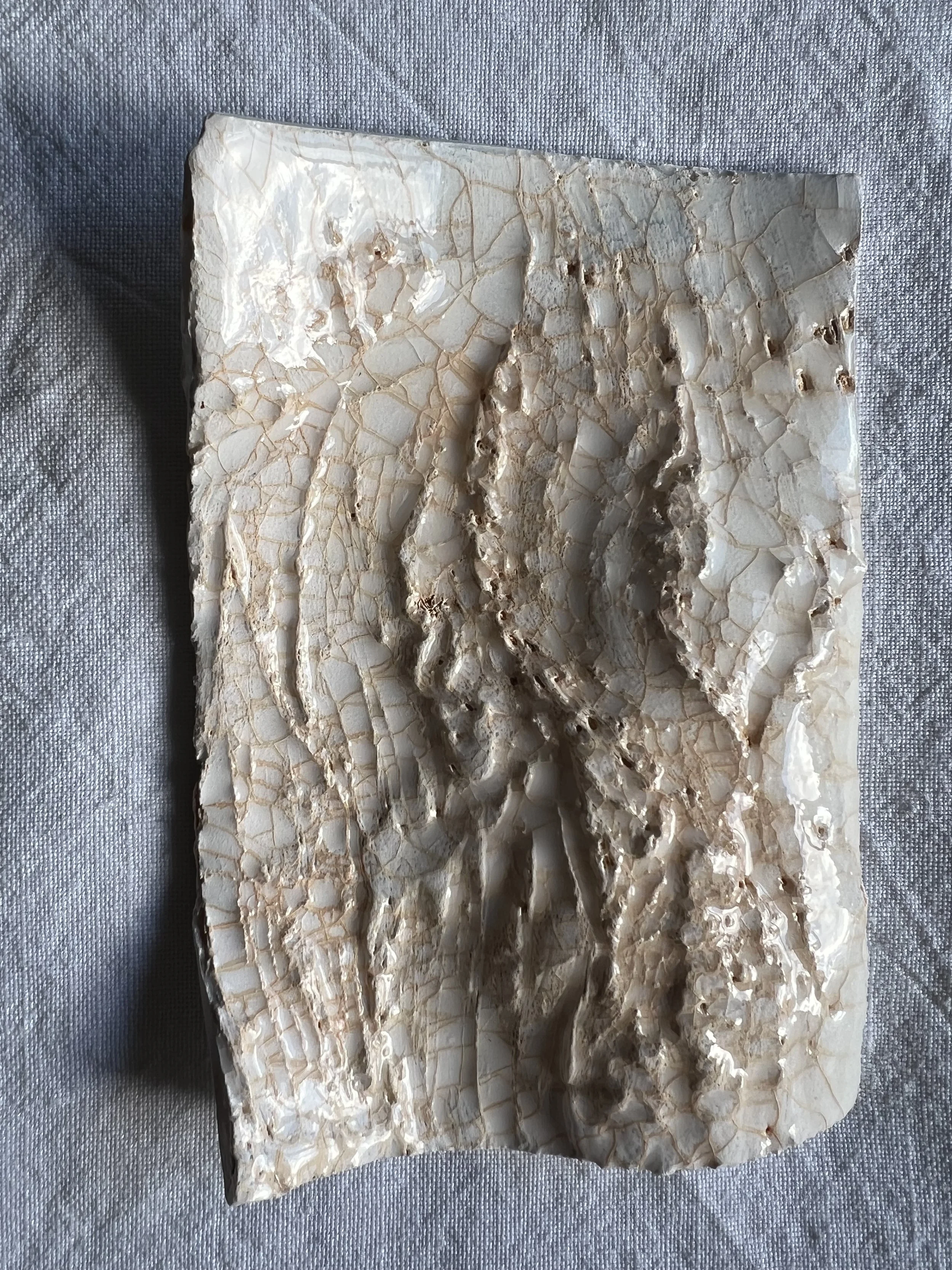 In working with clay, I’m using material that is literally earth – part of what forms the landscape - even when working with the refined and delicate porcelain. I took impressions from wood blocks that have been laser etched with photographic images of rock, which were then fired and, in some cases, glazed. I think the results can be read as representing a small fragment of something larger but at the same time, in the undulations of the forms and the tiny ridges and valleys in the surface of the porcelain, also an entire landscape. This captures that sense of duality, of an object that suggests simultaneously miniature and vast, or a sensation that is intimate and personal but also immense and universal.